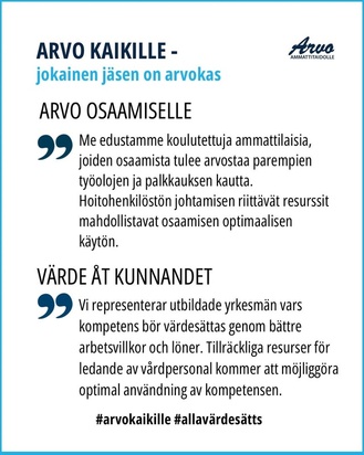 Tehyn Arvo ammattitaidolle – Värdera yrkeskunskapen valtuustoryhmä ja vaaliliitto ovat linjanneet tavoitteitaan seuraavalle Tehyn valtuustokaudelle 2025-2029. Ryhmä korostaa asiapitoisen ja tutkittuun tietoon pohjaavan vaikuttamisen tärkeyttä. Nimensä mukaisesti ryhmä nostaa esille ammattilaisten osaamisen. Tehyn jokainen jäsen on arvokas. Jokaisen jäsenen edunvalvonta on turvattava - valtakunnan tasolta paikalliselle tasolle kaikissa tehyläisissä ammateissa työskenteleville. Tehyn Arvo ammattitaidolle – Värdera yrkeskunskapen valtuustoryhmä ja vaaliliitto haluavat, että Tehy on moniääninen ja kutsuu jokaisen tehyläisen rakentamaan yhteistä tarinaa.